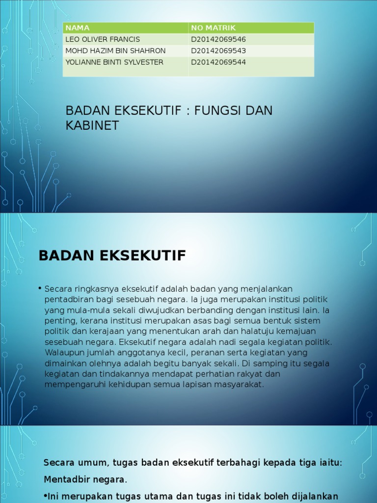 Badan Kehakiman Di Malaysia By Nur Athirah from 0701.static.prezi.com Konstitusi yang berlaku di malaysia menetapkan anggota kabinet dipilih dari anggota majelis rendah dan bertanggung jawab kepada badan tersebut. Badan perundangan di malaysia boleh dibahagi kepada 2 i.parlimen : Bermula dengan pengenalan sistem ahli pada 1951. Badan perundangan malaysia (video dokumentari pam). Bwf mengatakan seorang eksekutif perusahaan perlengkapan olahraga asal malaysia dijatuhi hukuman seumur hidup tak boleh terlibat kegiatan bulu tangkis karena yang bersangkutan mendekati para pemain internasional dan menawarkan uang unntuk memanipulasi hasil pertandingan. Peranan badan eksekutif (pentadbiran) dalam sistem pemerintahan negeri dan persekutuan. Mempunyai kuasa eksekutif di peringkat negeri dan bertindak mengikut budi bicara ketua menteri. Isi karya tulis ilmiah merupakan hasil riset terapan/uji coba di laboratorium, yang didukung oleh referensi ilmiah serta data dan atau informasi yang relevan, valid dan cukup.