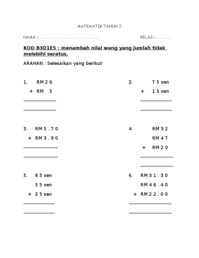Padankan mengikut nilai mata wang dengan harga barangan rm 40rm 11rm 15rm 25. Tahun 2 | matematik | tambah nilai wang matematik tahun 2: Wang tahun 2 tambah,tolak, darab dan bahagi wang. Matematik tahun 2 a) 2 ratus, 5 puluh dan 7 sa = b) 8 ratus, 0 puluh dan 9 sa = 4 padankan nilai digit yang telah dicerakinkan dengan nombor yang betul. Anda juga akan mempelajari pecahan mudah dan pengiraan wang dan masa.