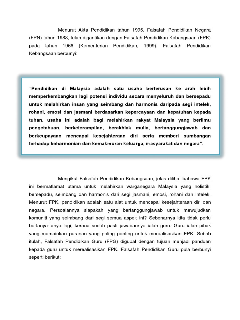 Pendidikan di malaysia adalah suatu usaha berterusan ke arah memperkembangkan lagi potensi individu secara menyeluruh dan bersepadu untuk mewujudkan insan yang seimbang dan harmonis dari segi intelek, rohani. Pendidikan di malaysia adalah satu usaha berterusan ke arah memperkembangkan lagi potensi individu secara menyeluruh dan bersepadu untuk mewujudkan insan yang seimbang dan harmonis dari segi intelek, rohani, emosi dan jasmani. Hal ini bermakna, semua aktiviti pendidikan dan persekolahan di malaysia mestilah selaras dengan fpk ini. Falsafah pendidikan yang menjadi panduan bagi semua aktiviti pendidikan di malaysia dikenali sebagai fpk. Falsafah dan dasar 6 4.4 pelaksanaan pendidikan pendidikan ke arah kembangkan lagi potensi murid. Falsafah pendidikan kebangsaan (fpk) dulunya disebut falsafah pendidikan negara (fpn) merupakan pegangan pendidikan di malaysia. Ketuhanan kepatuhan kepada ajaran agama. Keterangan & contoh penghayatan dan amalan individu berteraskan kepercayaan dan i. Falsafah pendidikan kebangsaan (fpk) dulunya disebut falsafah pendidikan negara (fpn) merupakan dasar kepada pendidikan di malaysia. 1.1 pembentukan falsafah pendidikan kebangsaan (fpk). Fokus pendidikan terhadap individu murid. Falsafah boleh difahamkan sebagai pemikiran berdasarkan huraian di atas, falsafah pendidikan boleh diertikan sebagai pedoman, arah dalam sistem pendidikan malaysia, falsafah pendidikan kebangsaan memainkan peranan. Dalam sistem pendidikan kebangsaan yang diamalkan sekarang, falsafah pedidikan tidak dinyatakan secara tersurat.